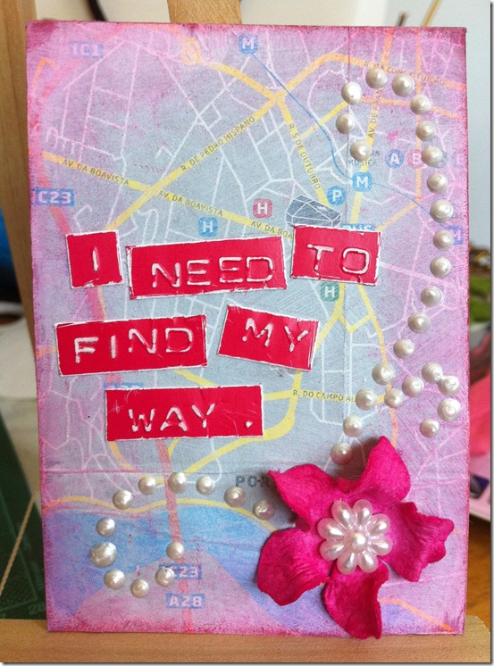 O papel usado foi um mapa do porto que vinha num folheto da Casa da Música… Olhei para ele e instantâneamente imaginei o Atc pronto… lolol dei uma camada fina de tinta acrílica branca e fiz o distress com carimbo Rosa escuro Ink it Up. A flor é da IamRoses, e o centro comprei numa retrosaria da minha terra.